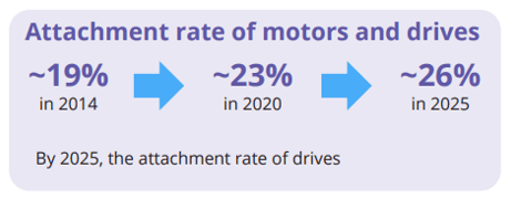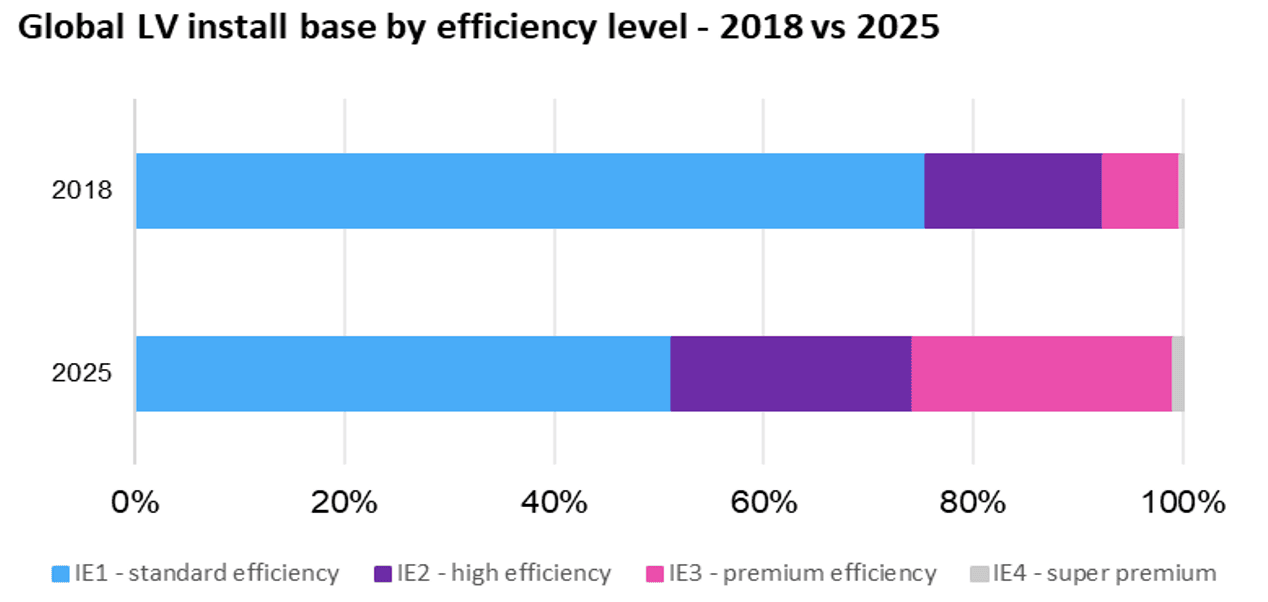 In 2018 more than three quarters of installed motors were low efficiency IE1 motors. However, higher efficiency motors are growing quickly — The installed base of IE3 and IE4 motor is projected to grow at unit CAGR of 22% from 2020 to 2025.
