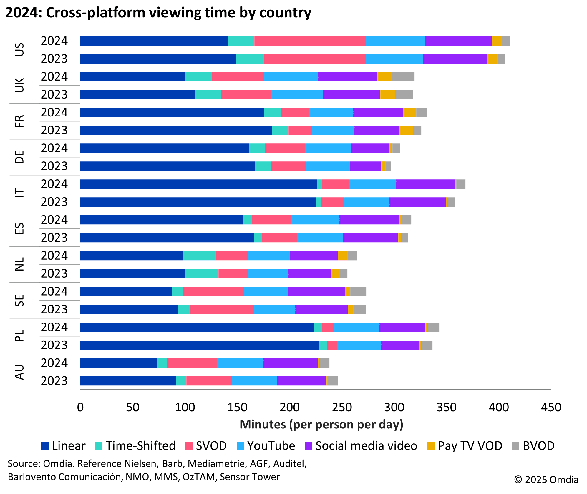 Per Omdia’s annual analysis of viewing time, the average total daily viewing time across 10 analyzed markets in full year 2024 stood at 359 minutes per person per day (5 hours and 59 minutes), marking a 5-minute increase over the previous year (+1.4%). With a global average of 17 waking hours per day, this means that 35% of the day is spent consuming video content across all markets combined. The power of engagement is clear.