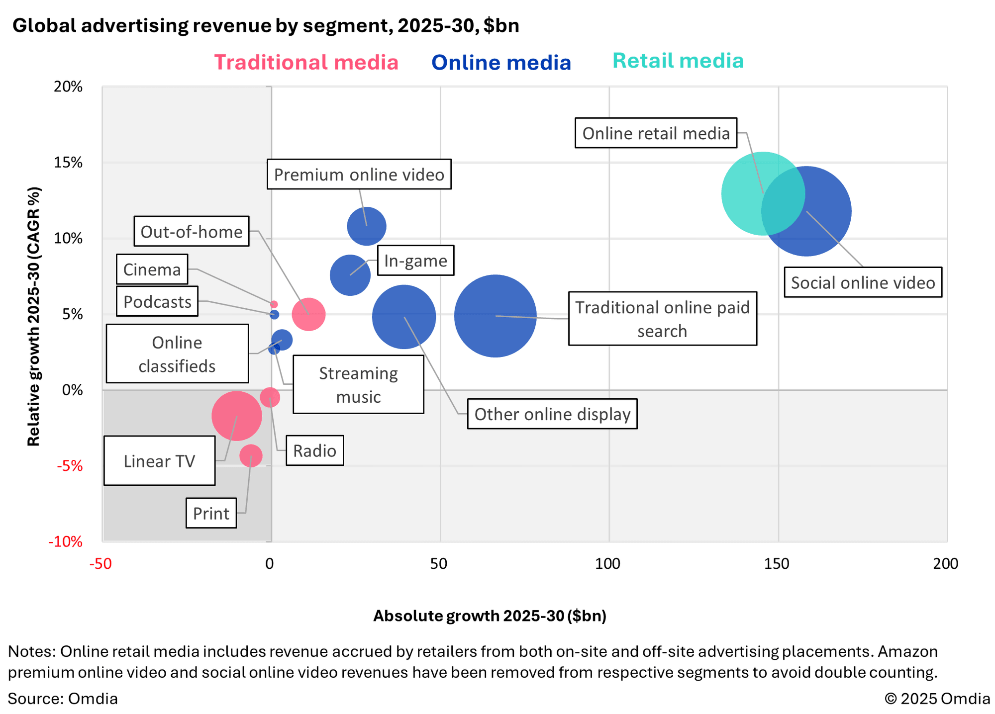 Retail media, which sees retailers place ads across their own and partners’ online properties, has quickly emerged as one of the fastest-growing segments of the global advertising market. Globally, retailers effectively doubled their online advertising revenue from 2020 to 2024, reaching $144bn amid a global e-commerce boom – overtaking the entire linear TV ad segment in the process. This will grow to almost $300bn by 2030 as retail media becomes a core aspect of retailers’ profitability strategies and continues to augment the connection between buyers and sellers, closing the loop on online sales attribution in the process.